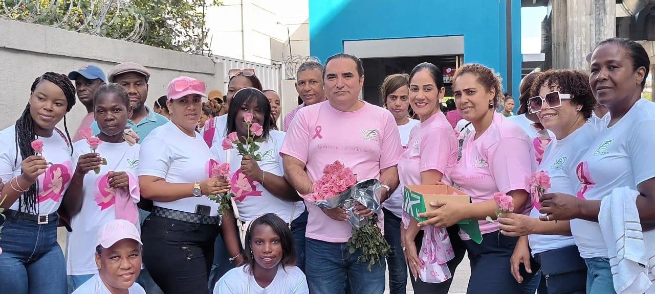 Santo Domingo Norte.- En la conmemoración del Día Mundial contra el Cáncer de Mamá, que se celebra cada 19 de octubre, el precandidato a diputado por este municipio, Víctor Pavón, se solidarizó este jueves con mujeres de diferentes edades, que circulaban por los alrededores de la parada Mamá Tingó del Metro de Santo Domingo, entregándoles flores y lazos rosas a cada una de ellas.