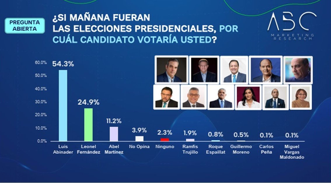 SANTO DOMINGO.- Si las elecciones fueran hoy, el presidente Luis Abinader sería reelecto en primera vuelta con el 54.3% de los votos, Leonel Fernández obtendría 24.9% y Abel Martínez 11.2%, según la encuesta de la firma peruana ABC Marketing cuyos resultados fueron presentados la mañana de este martes.