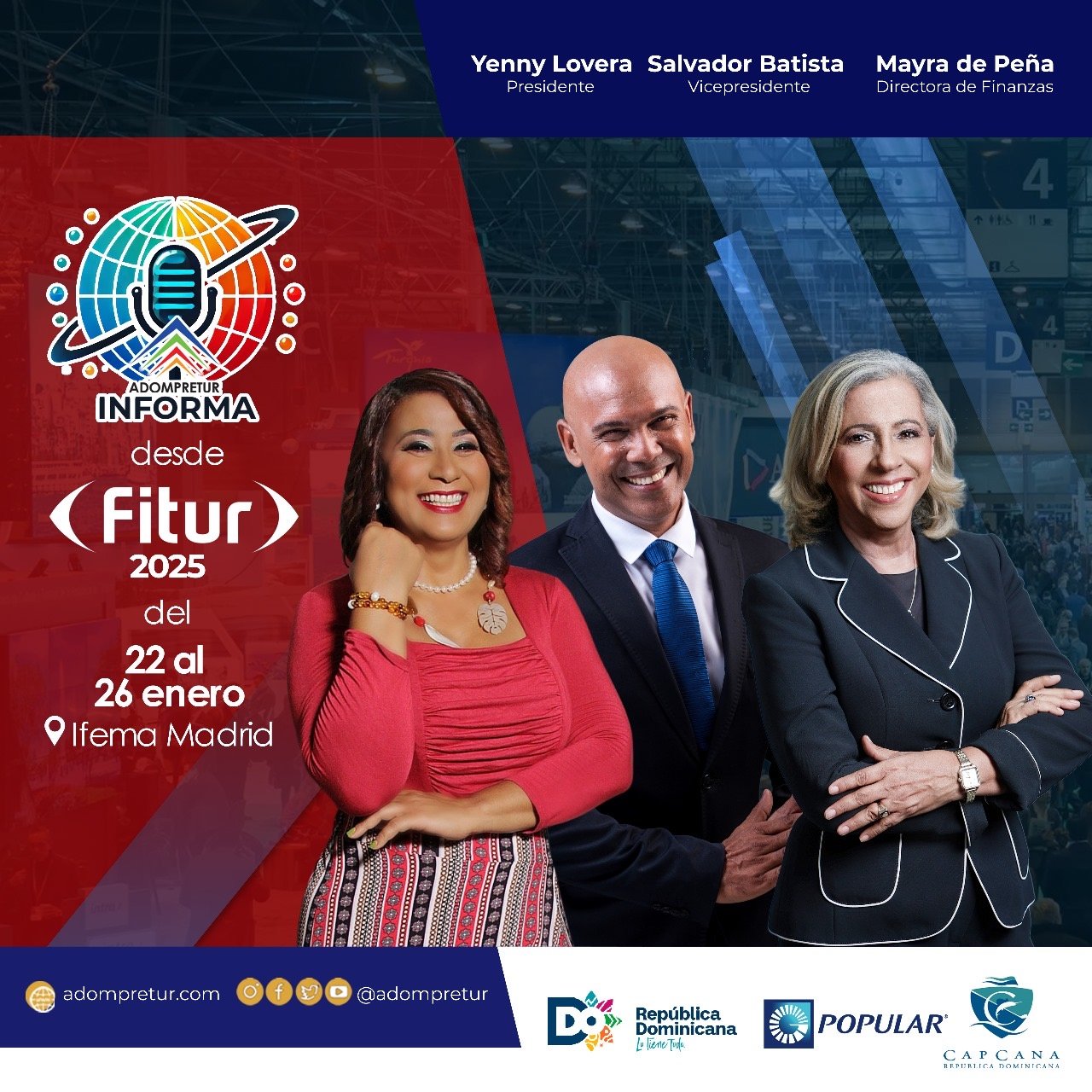 Destacó además que en esta cobertura especial contará con la colaboración de Salvador Batista, vicepresidente; Mayra De Peña, directora de Finanzas; otros directivos y representantes de las filiales de la institución que, desde el stand de República Dominicana, que invita a los visitantes a sumergirse en lo mejor de nuestro país mediante un diseño 3D, estarán transmitiendo al país las novedades y buenas noticias a través de YouTube, la página www.adompretur.com y en Instagram con el hashtag #fitur2025 @adompretur.