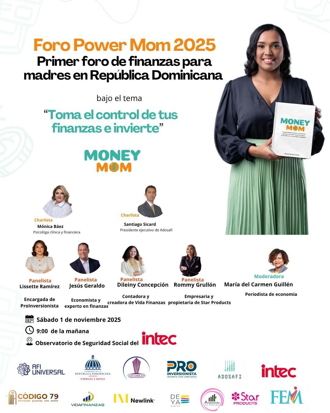 Durante el foro se hará la puesta en circulación de la guía “Money Mom”, de autoría de Massiel de Jesús Acosta, respaldada por instituciones comprometidas con la educación financiera en el país, entre ellas la Superintendencia de Bancos (SB), la Asociación de Bancos Múltiples de la República Dominicana (ABA), el Banco Popular Dominicano, AFI Universal, el Ministerio de Energía y Minas (MEM) y la Confederación Dominicana de Micro, Pequeñas y Medianas Empresas de la Construcción (Copymecon).