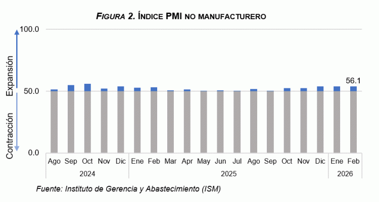 En este sentido, el desempleo general en los Estados Unidos se ubicó en 4.4% en febrero, ligeramente por encima del 4.3% registrado en enero de 2026, con una pérdida neta de 92,000 empleos. En el caso de la población latina, la tasa de desempleo alcanzó 5.2%, aumentando desde el 4.9% observado en enero. No obstante, el índice de gestores de compras (PMI, por sus siglas en inglés) no manufacturero del Instituto de Gerencia y Abastecimiento (ISM) registró un valor de 56.1 en febrero, superior al 53.8 de enero, lo que indica una expansión del sector servicios. Este sector concentra una proporción importante del empleo de la diáspora dominicana, lo que contribuyó a amortiguar parcialmente la caída del empleo.