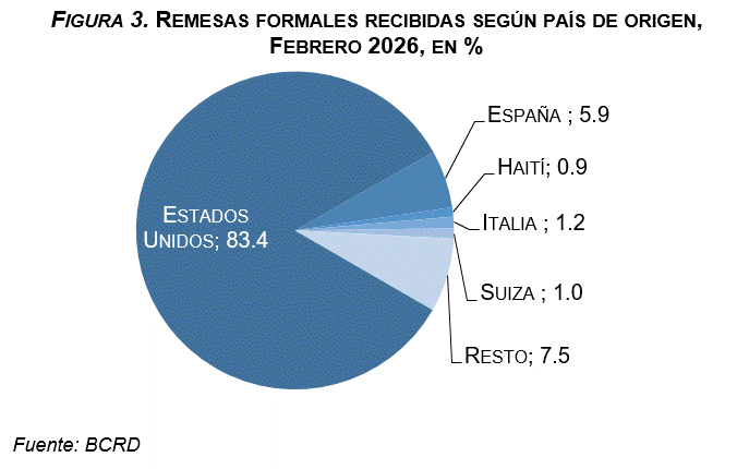 El BCRD destaca también la recepción de remesas por canales formales desde otros países en el mes de febrero, como España, por un valor de US$46.7 millones, un 5.9% del total, siendo este el segundo país en cuanto al total de residentes de la diáspora dominicana en el exterior se refiere, así como Italia y Suiza, con 1.2% y 1.0% de los flujos recibidos, respectivamente. En el resto de la recepción de remesas se distinguen países como Haití, Canadá y Panamá, entre otros.