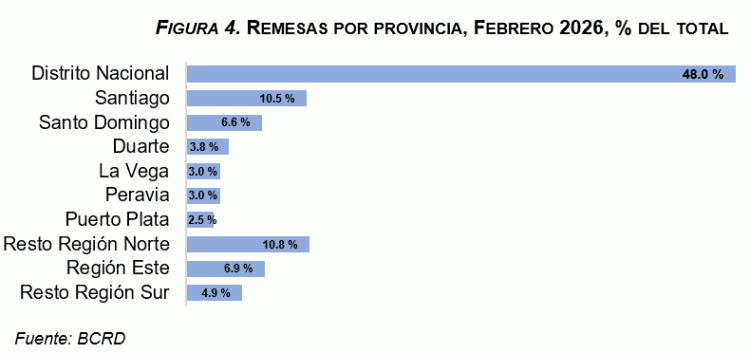 Respecto a la distribución de las remesas recibidas por provincias, el BCRD señala que el Distrito Nacional recibió una proporción del 48.0% durante febrero, seguido por las provincias de Santiago y Santo Domingo, con un 10.5% y 6.6%, respectivamente. Esto indica que casi dos tercios (65.1%) de las remesas se recibe en las zonas metropolitanas del país.