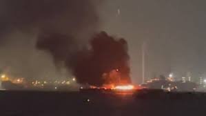 Imágenes aéreas emitidas por la emisora pública NHK el lunes por la noche mostraron una de las embarcaciones en llamas en el mar frente a Yokohama, una ciudad al sur de Tokio, con chispas rosas y blancas volando en todas direcciones.