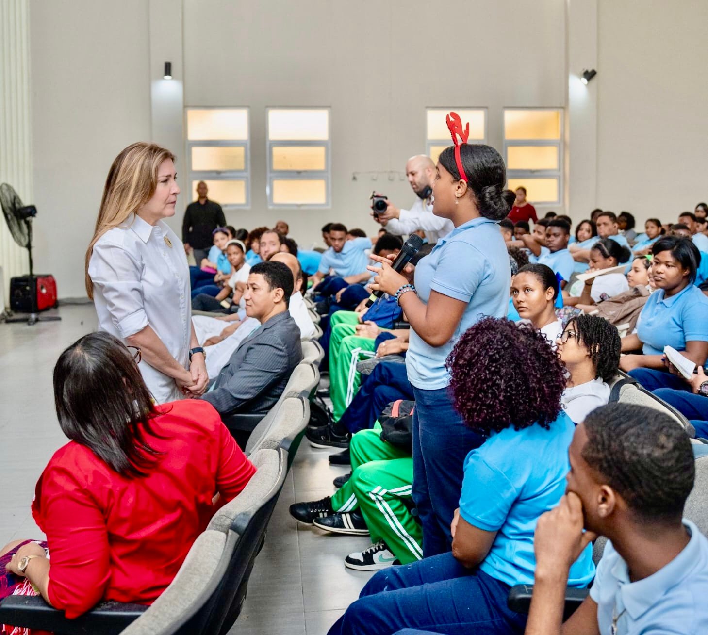 Santo Domingo, DN- Carolina Mejía, al sostener una conversación con los estudiantes del Instituto de Señoritas Salomé Ureña, mediante el programa La Alcaldía Llega a los Centros Educativos, destacó la importancia de la recuperación de los espacios públicos y, con ello, el cuidado del medio ambiente.
