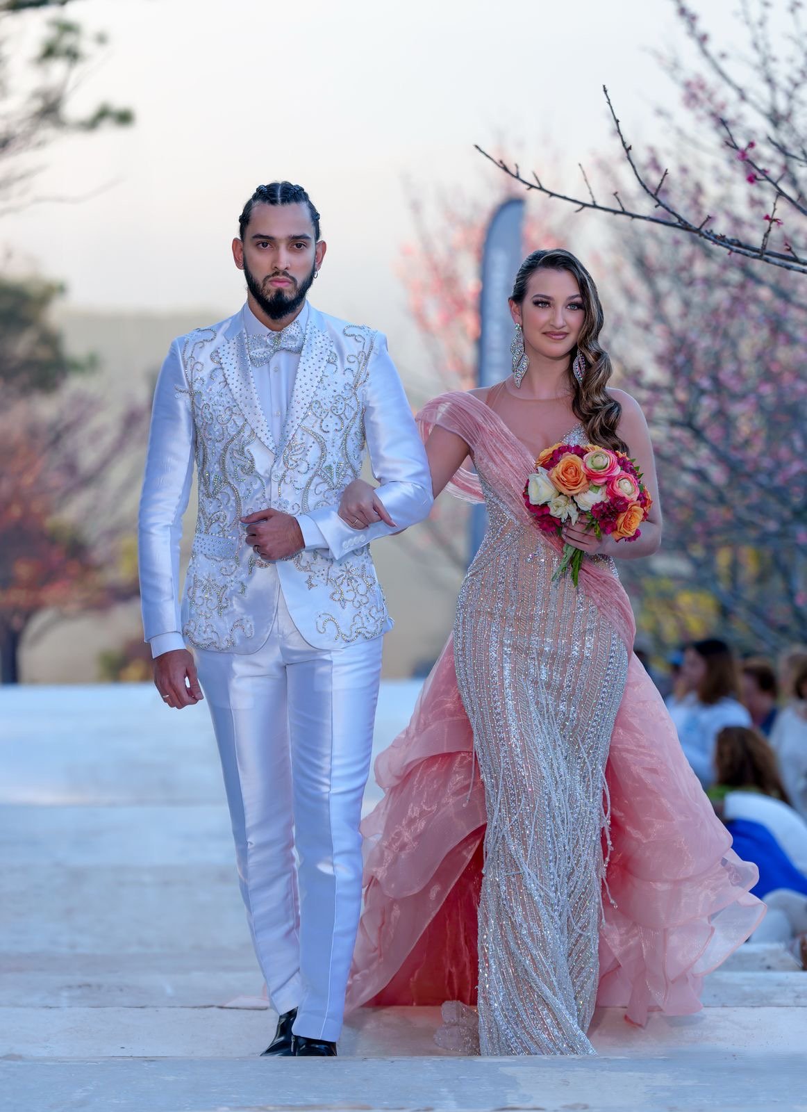 La colección Ether of Dawn by Eddy Rambaldy es una creación sublime que fusiona la belleza del cerezo en flor con la magia de los atardeceres primaverales. Inspirada en estos elementos naturales, la colección explora una paleta de tonos que van desde rosas suaves hasta vibrantes, logrando un equilibrio entre frescura y sofisticación. Las piezas, confeccionadas en organza, seda y encajes bordados sobre tul, incorporan detalles geométricos y pedrería, un sello distintivo del diseñador. El resultado es una propuesta que combina ligereza, glamour y modernidad. «Cada prenda es una expresión de elegancia y estilo con un toque artístico», destacó Rambaldy.