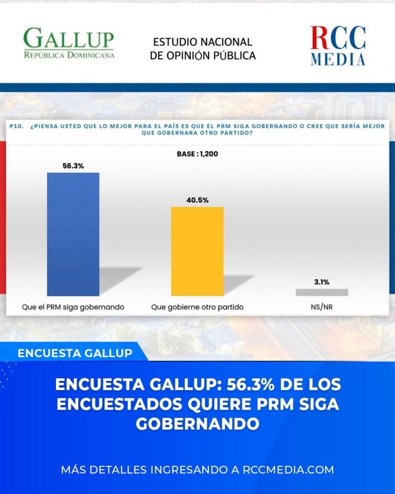 El 56.3% de los encuestados por la firma Gallup para el Grupo RCC Media quiere que el Partido Revolucionario Moderno (PRM) siga gobernando más allá del 2024. Así lo revelan los datos de la más reciente encuesta de la firma, que recoge los datos de entrevistas realizadas a mil 200 personas desde el 25 al 29 de octubre de este año.