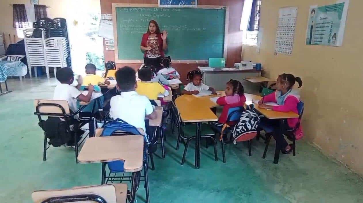 En la comunidad El Aguacate, del distrito municipal San Francisco de Jacagua, en Santiago, los estudiantes de la Escuela Angelita Suárez del distrito educativo 08-06, reciben docencia en un pequeño espacio dentro de una iglesia, debido a la falta de una escuela.