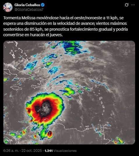 La directora del Indomet, Gloria Ceballos, informó a través de su cuenta en X que "la tormenta Melissa se mueve hacia el oeste/noroeste a 11 kilómetros por hora; se espera una disminución en la velocidad de avance, con vientos máximos sostenidos de 85 kilómetros por hora. Se pronostica un fortalecimiento gradual y podría convertirse en huracán el jueves".