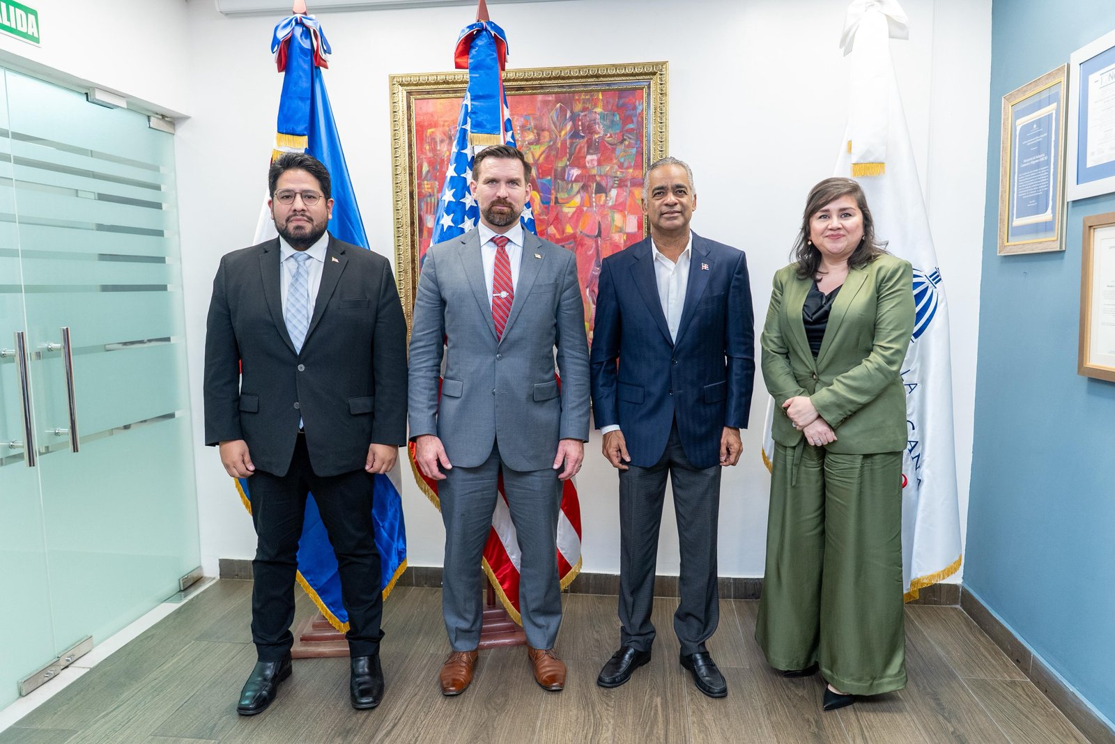 Santos se reunió con Michael Jensen, director senior de Asuntos del Hemisferio Occidental del Consejo de Seguridad Nacional, Joseph M. Humire, subsecretario de Defensa para Asuntos del Hemisferio Occidental y Patricia Aguilera, encargada de Negocios en la Embajada de los Estados Unidos en Santo Domingo.