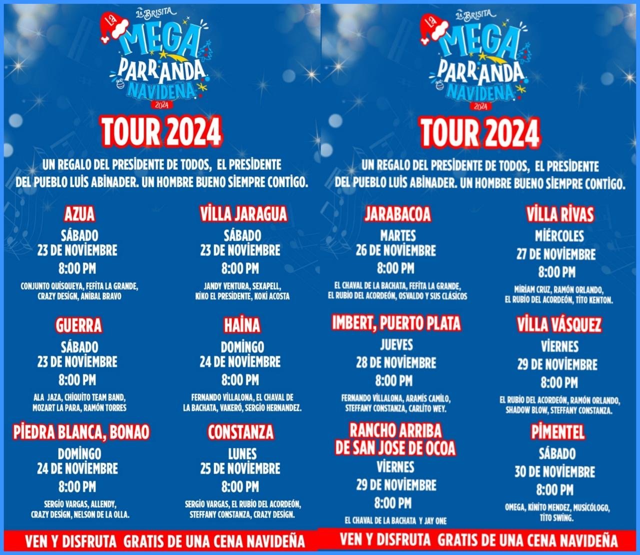 Más de 35 orquestas de alta popularidad estarán llenando de alegría, ritmos y emociones la Megaparranda Navideña, una serie de multitudinarios conciertos que incluye unas 100 mil cenas navideñas para los asistentes gracias al presidente Luis Abinader.