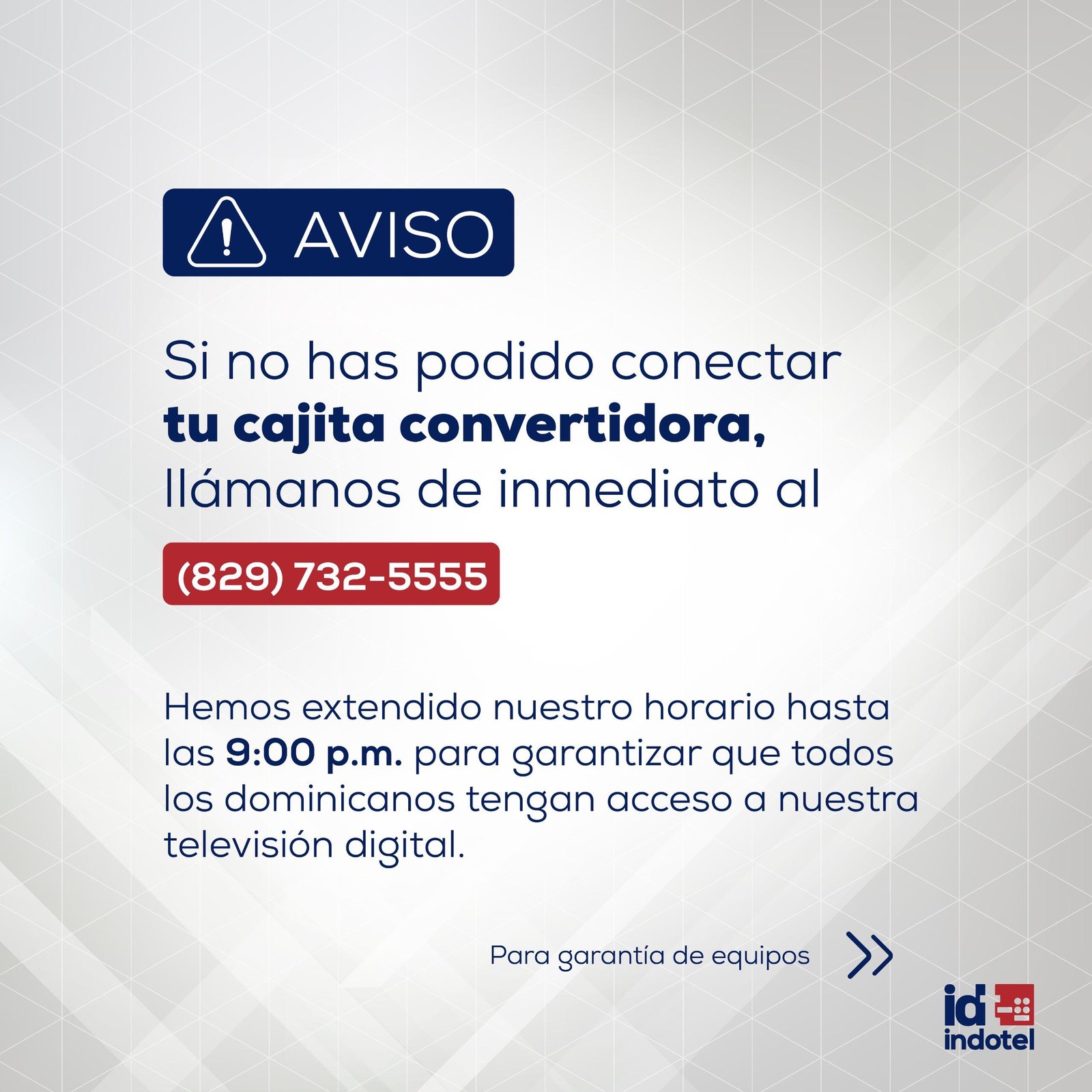 El Instituto Dominicano de las Telecomunicaciones (INDOTEL) informa que ha extendido el horario de atención al usuario, con el propósito de que los ciudadanos que requieran soporte para conectar la caja convertidora de señal a sus televisores, puedan recibir asistencia oportuna y así acceder al servicio de televisión digital.