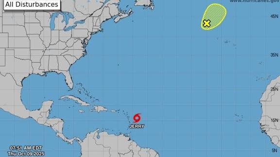 Según el Centro Nacional de Huracanes de EE. UU., a las 5:00 a.m. AST el centro de Jerry estaba en la latitud 15,7° Norte y longitud 57,7° Oeste, unos 640 kilómetros al este-sureste de las Islas de Sotavento del Norte. Se desplazaba hacia el oeste-noroeste a unos 31 km/h, con vientos sostenidos de aproximadamente 100 km/h y ráfagas más fuertes. La presión central era de 999 milibares.