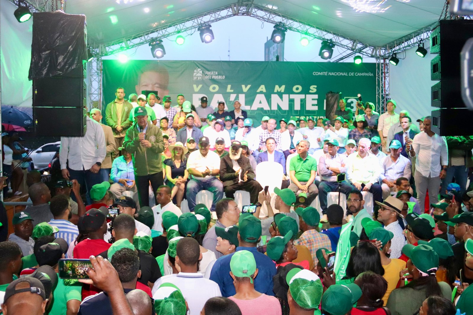 Leonel Fernández habló bajo un torrencial aguacero que caía en Monte Plata, el cual no impidió a la multitud permanecer en el lugar para escuchar el candidato presidencial del partido Fuerza del Pueblo (FP) y organizaciones aliadas, que acudió a respaldar al candidato a senador de esta provincia, Juan Hubieres, y los candidatos a diputados.