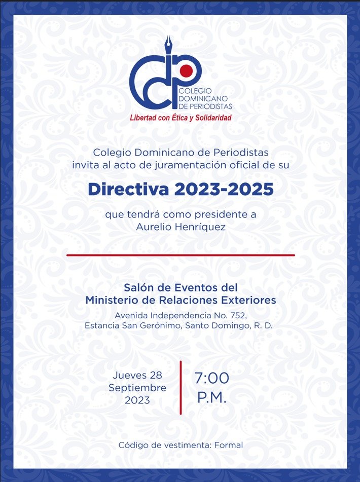 SANTO DOMINGO. Los nuevos directivos del Colegio Dominicano de Periodistas (CDP), para el período 2023-2025 tomarán posesión este jueves 28 de septiembre en un acto de juramentación a realizarse en el Salón de Eventos del Ministerio de Relaciones Exteriores (Mirex) de la avenida Independencia 752 del Distrito Nacional a las 7:00 de la noche.