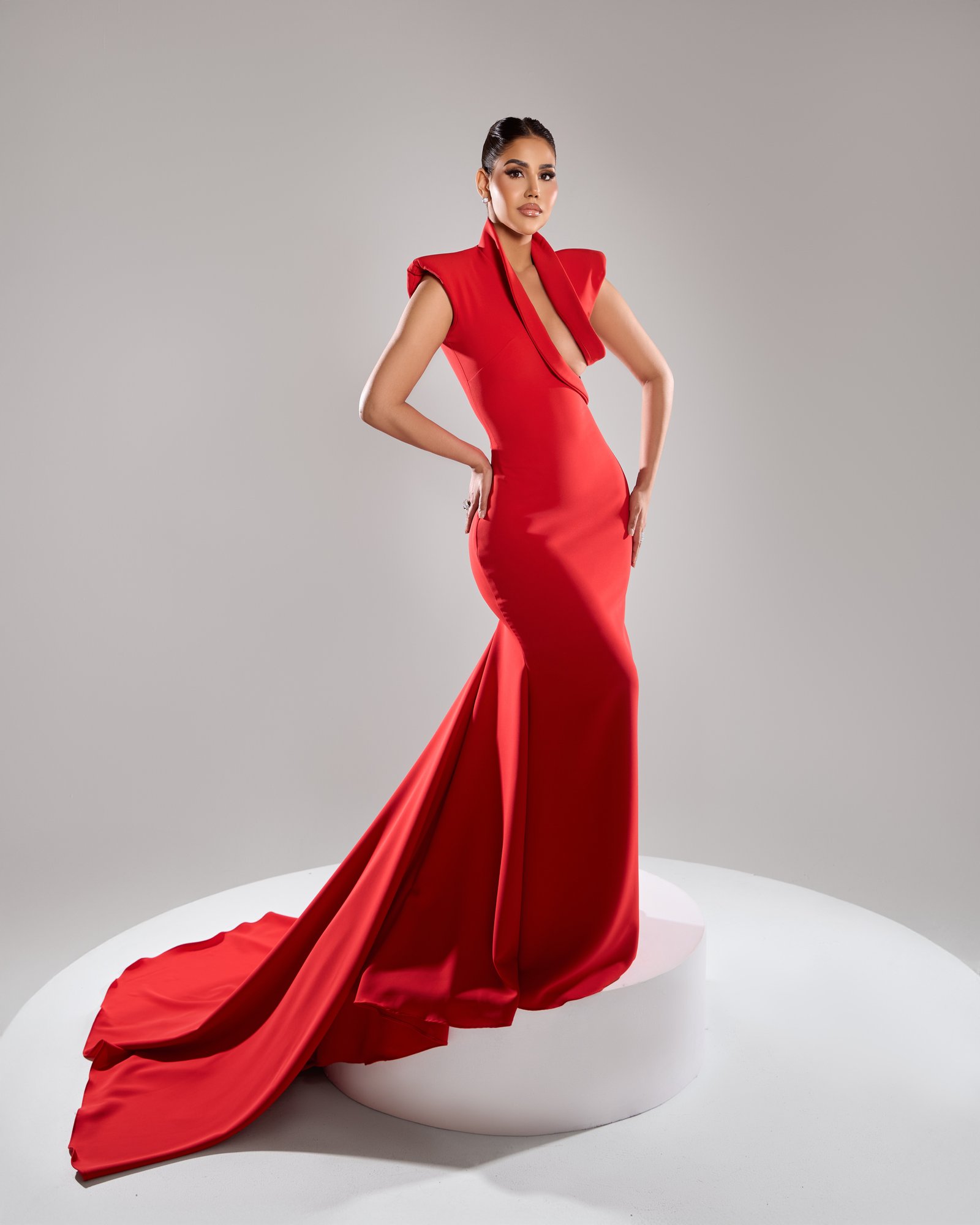 Oriana Falla deslumbra con diseño de Suzelle Taveras en impactante vestido rojo