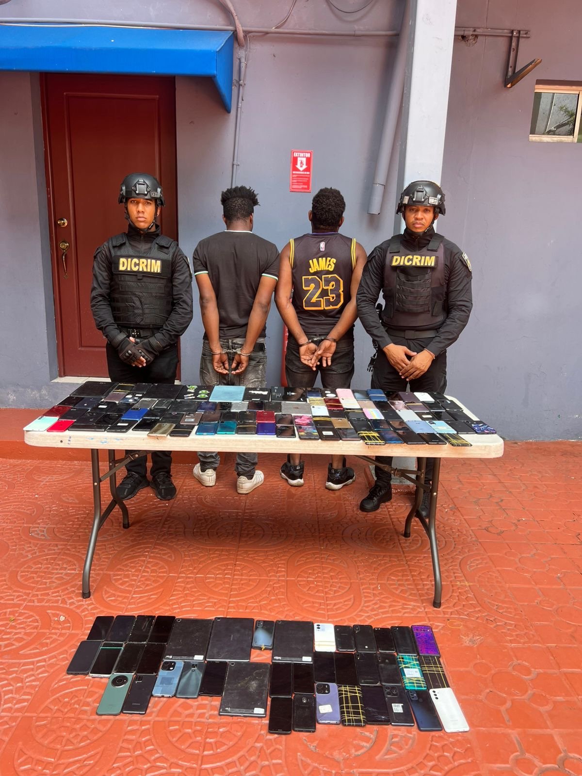 Distrito Nacional, R.D. – En el marco de las acciones contra el robo y comercialización ilegal de equipos electrónicos, miembros de la Dirección Central de Investigación (DICRIM) apresaron en flagrante delito a dos nacionales haitianos en la avenida Duarte esquina parque Enriquillo, sector Villa Francisca, Distrito Nacional, ocupándoles más de 190 celulares y ocho tabletas.