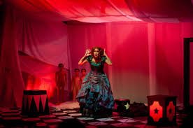 En casi oscuridad (a propósito), y luego con luces rojas, como si iniciara una función de circo, Sabrina Gómez salió a escena cubierta hasta la cabeza de negro cual si fuera una bestia guiada por su domador, un misterioso hombre de sombrero negro a quien "La Monstrua" le confío su vida y su amor, e interpretado por el excelente actor Miguel Lendor (Papachín).