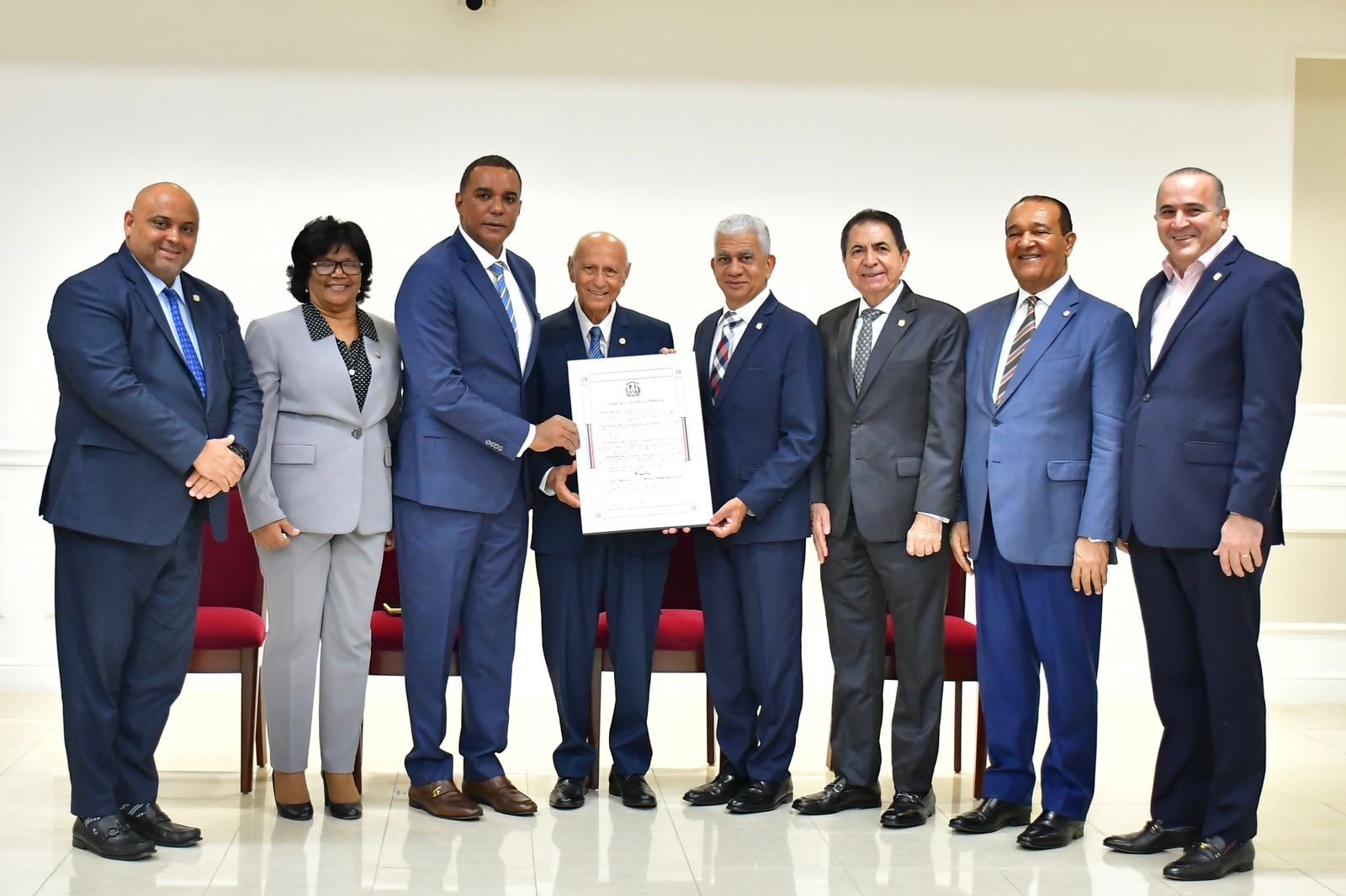 El pergamino de reconocimiento al doctor López Gutiérrez lo entregó el presidente del Senado, Ricardo de los Santos junto al senador Carlos Gómez, Melania Salvador Jiménez, Milcíades Franjul, Alexis Victoria, Lenin Valdez y Antonio Marte.