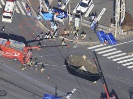 Un camionero japonés atrapado en un socavón que se abrió en medio de la calle